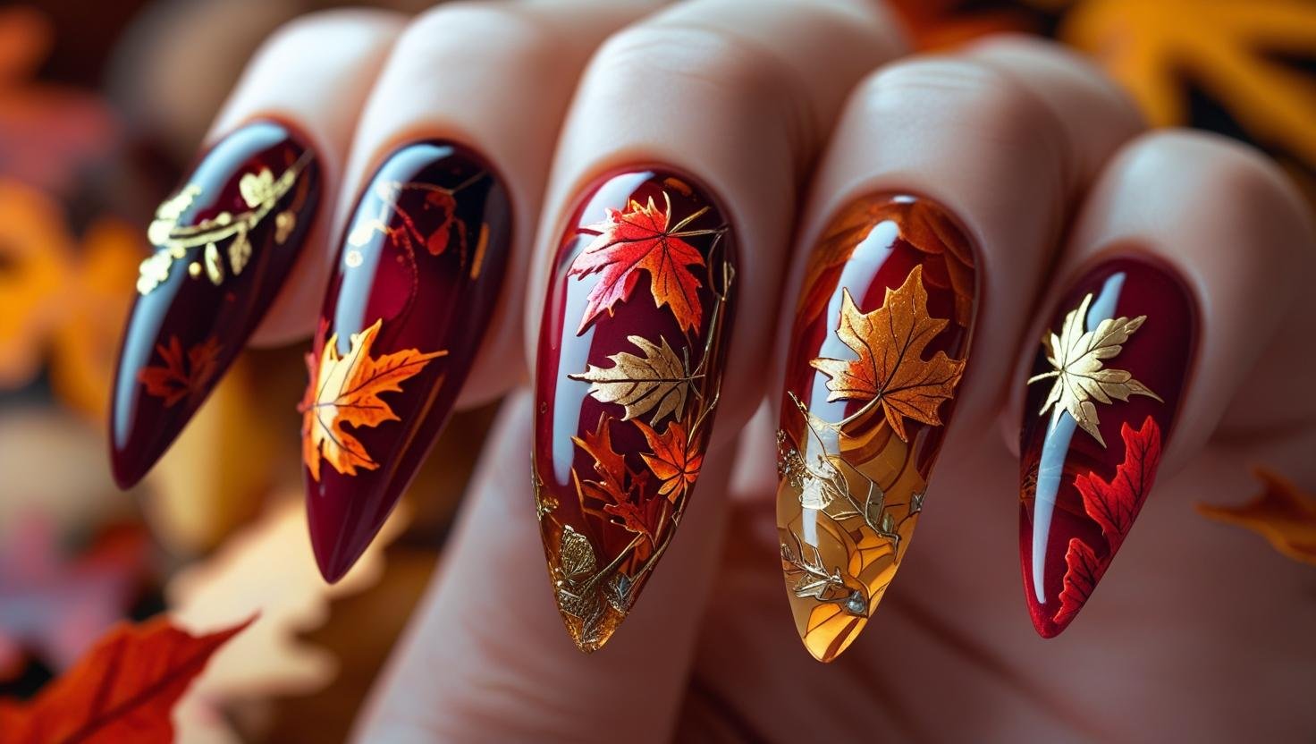 Mix warm-toned swirls, gold accents, and earthy shades for unique fall nail art.